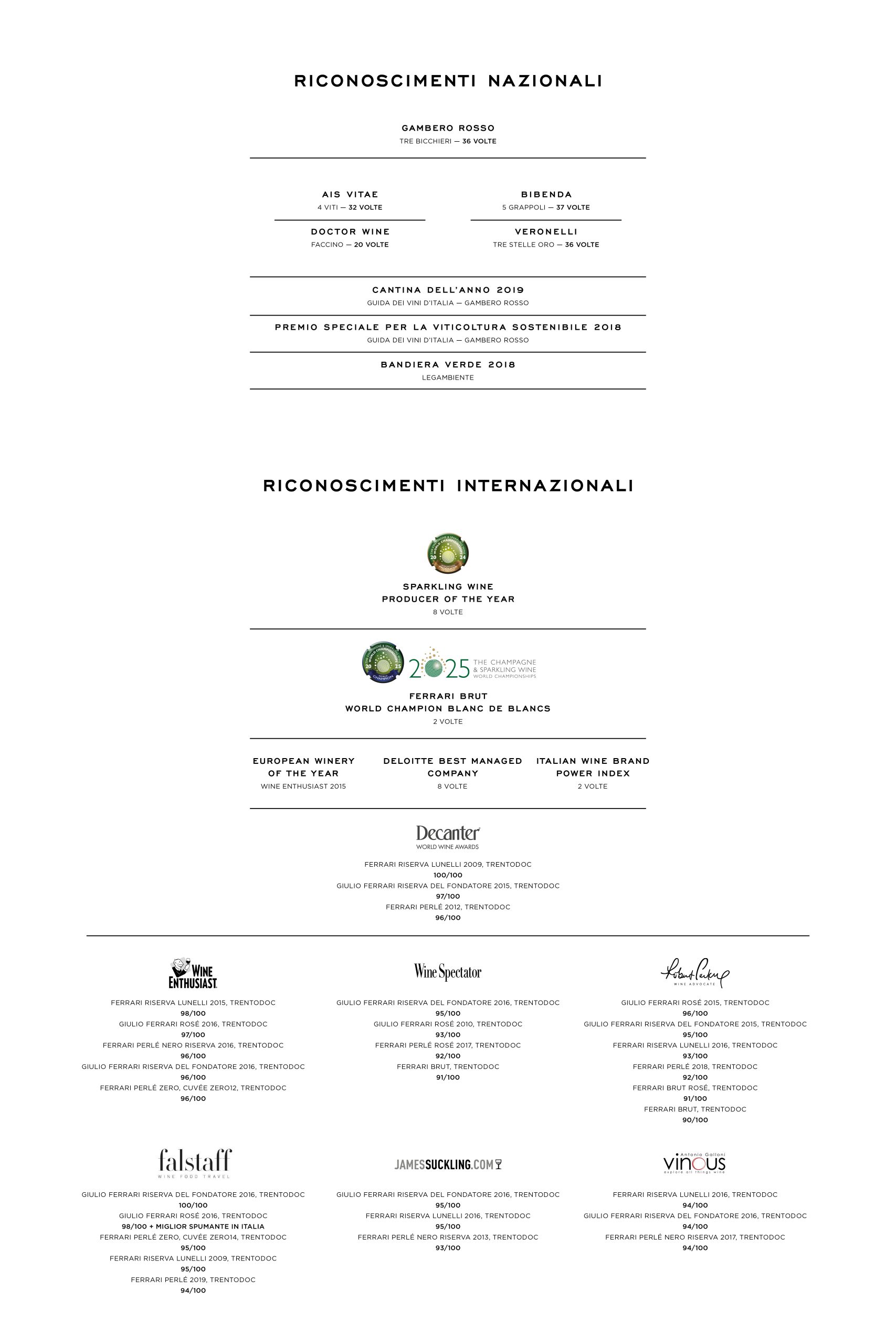 Ogni anno, il Trentodoc della famiglia Lunelli è consacrato al vertice della produzione italiana dalle più importanti guide di settore. Wine Spectator, la bibbia internazionale del vino, si riferisce a Ferrari Trento come “il più grande, il più antico e il più celebrato produttore di spumante Metodo Classico […] che crea millesimati che reggono il confronto con le più prestigiose e costose etichette di Champagne”.